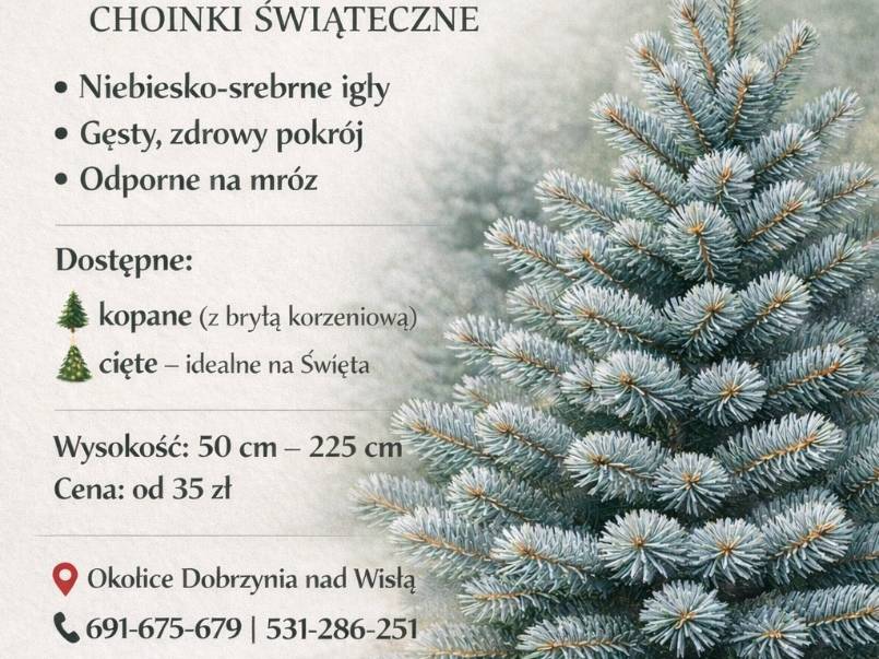 Wysokiej jakości drzewka Świerka Srebrnego, przeznaczone zarówno do nasadzeń ozdobnych, jak i jako choinki bożonarodzeniowe. Drzewka oferowane są w dwóch wariantach: kopane z bryłą korzeniową lub cięte.
