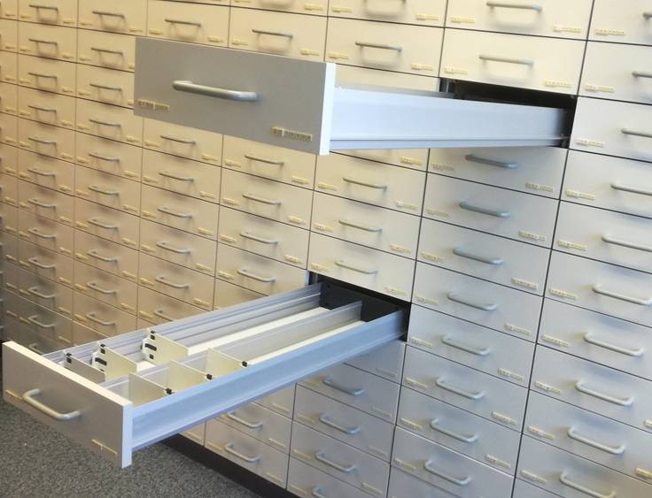 W pionie jest około 15-17 szuflad na łożyskach, szuflada wyposażona jest w przegrody i boczne opisy. Szuflady wystąpuja w głbokościach 0d 100-120cm oraz szerokości od 39, 5 do 42, 5cm.
