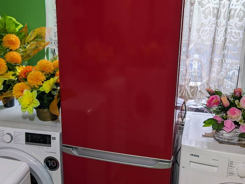 Używana lodówko-zamrażarka Hanseatic w kolorze czerwonym.