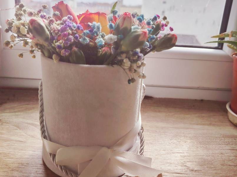 Sprzedam ręcznie robiony flower box ze świeżych kwiatów (róże, tulipany, dodatki).