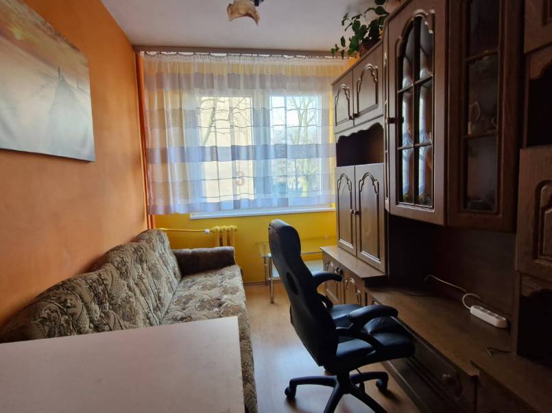 Sypialnia / Gabinet – funkcjonalny pokój z kanapą, szafą, komodą i biurkiem, idealny jako miejsce do pracy lub odpoczynku.